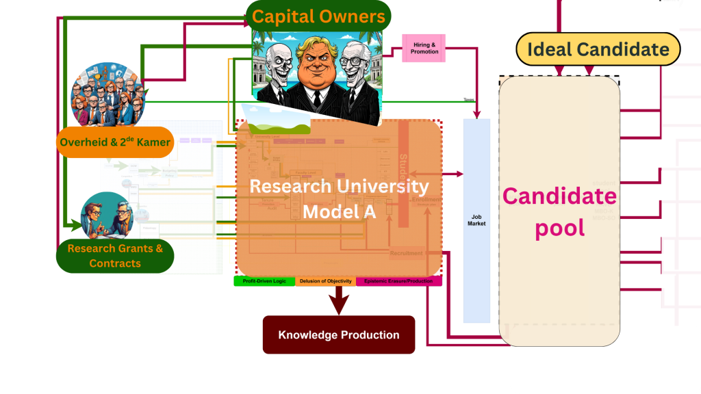 This is an analysis of power. It’s a map of how the Dutch higher education system is engineered, who it is designed for, and who it systematically filters out. Using a model (A) Dutch research University with centralized nested structure as a starting point, we will trace the three primary flows that animate this structure: the flow of funds, the flow of policy, and the flow of people. We will see how these flows merge into a single, powerful current that directs knowledge production toward certain ends and away from others. Furthermore, we will follow the path to a hypothetical post-doctoral position, witnessing how intersectional marginalization creates a compounding web of hurdles that makes this path a near-impossibility for many.
