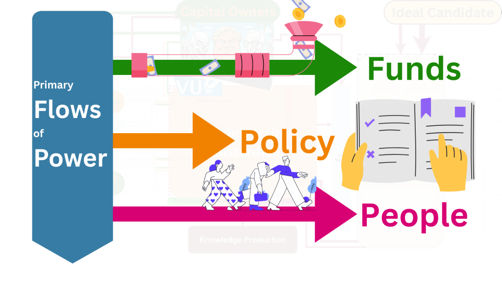(Simplified) Visual mapping of Nested Power structures within Dutch Higher Education landscape and its 3 flows. Vrije Universiteit is examined for the initial case